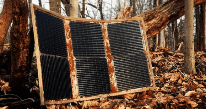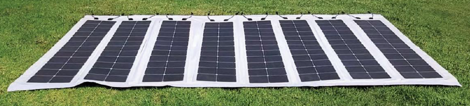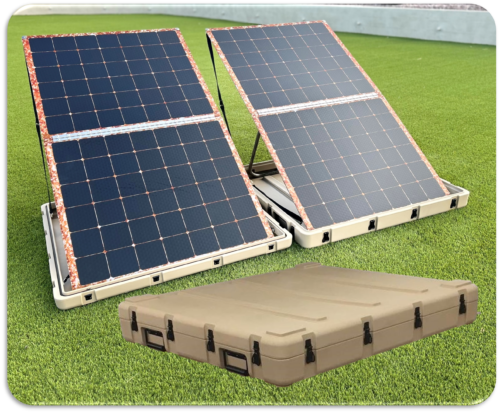 Rugged, portable all-in-one glass-free solar panel + rack systems up to 600-watt
